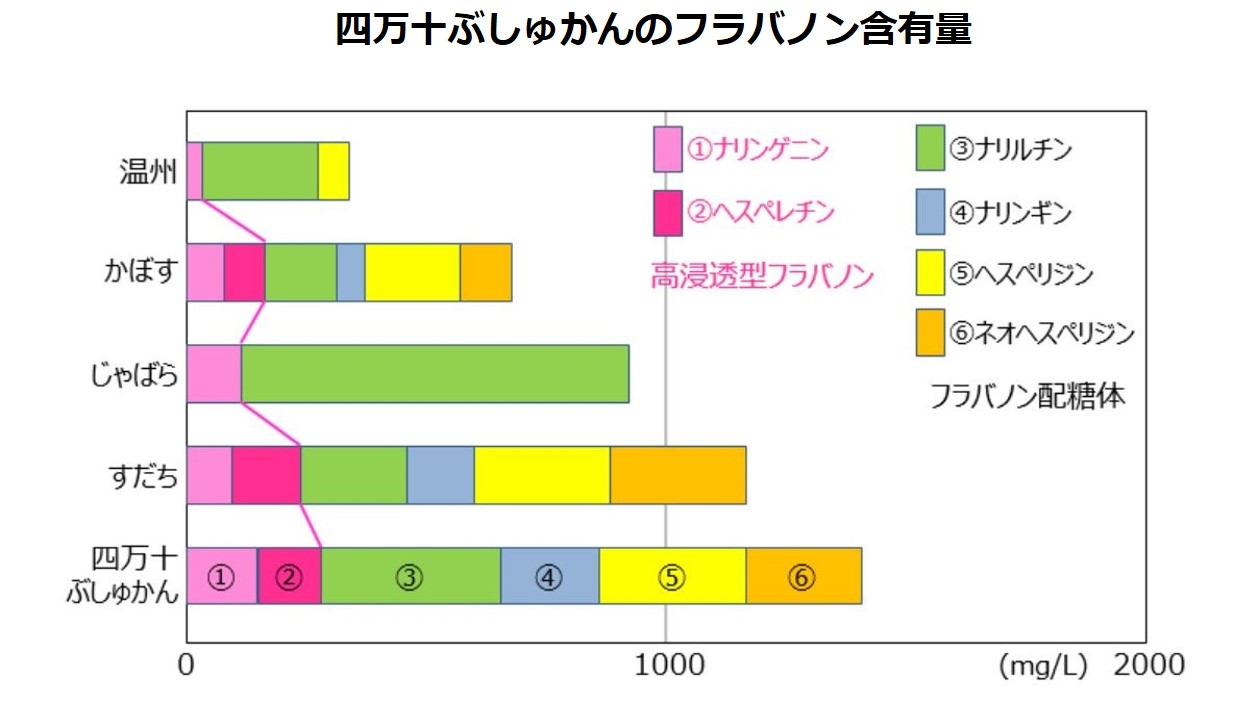 柑橘には、ヘスペリジンンなどの有効成分が豊富に含まれていることが知られています。そこで、有名な柑橘と四万十ぶしゅかんのフラボノイド含有量を、独自に比較しました。すると、四万十ぶしゅかんは有効成分フラバノン総量が柑橘No.1※であることが判明しました。フラボノイド内のヘスペリジンが多いだけでなく、高浸透型ヘスペリジン(低分子のヘスペレチンのこと)も豊富に含んでいることがわかりました。※サティス製薬調べ