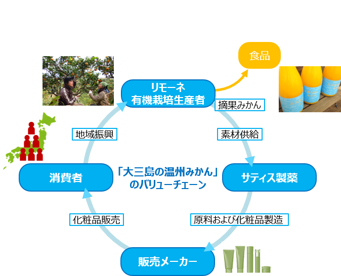 化粧品により「大三島の温州みかん」に付与された新しいバリューが、生産者と地域にフィードバックされます。